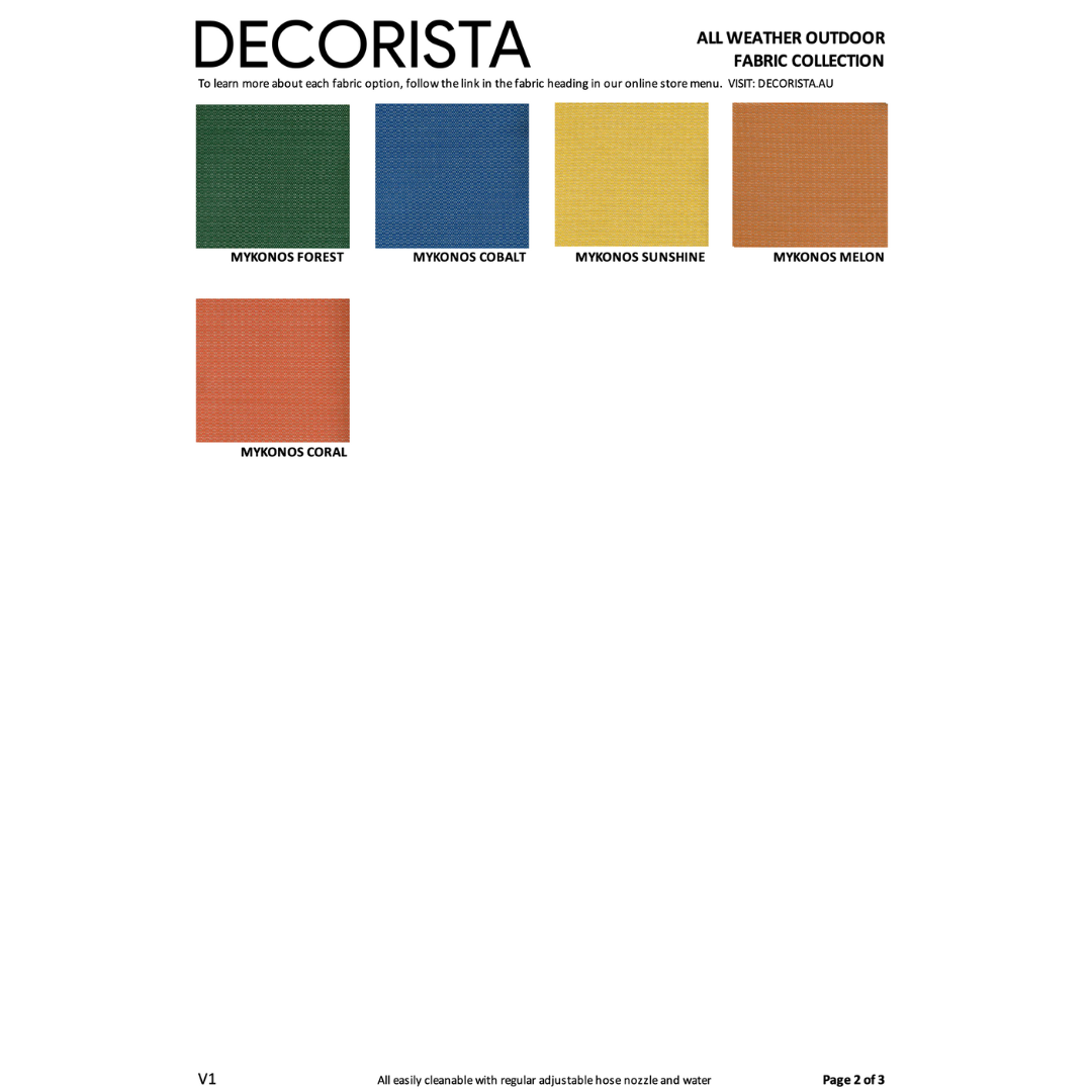 Upholstered in U.V. Safe outdoor performance fabric. Tolerates our Australian climate, including sun, wind, rain and is also suitable for coastal locations.